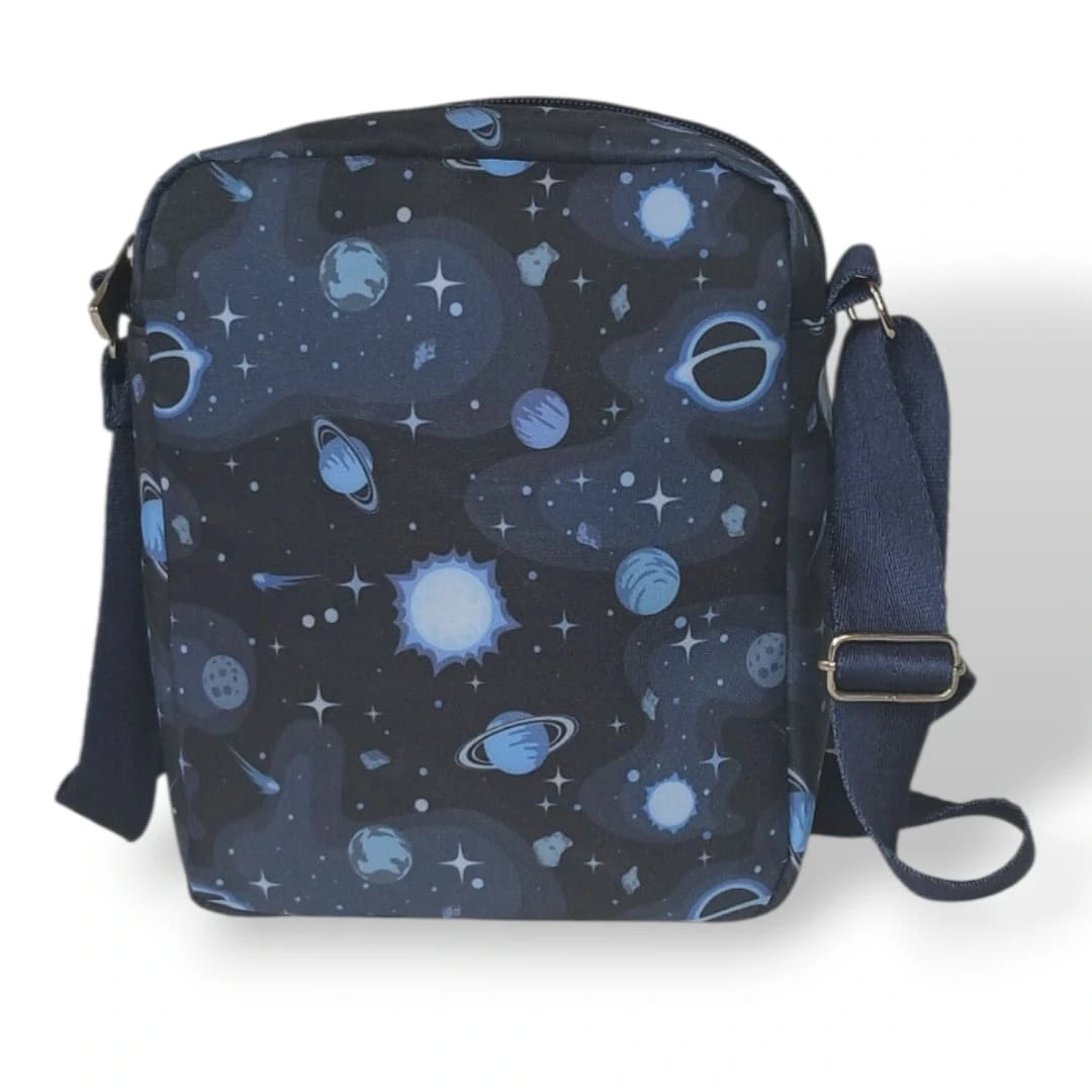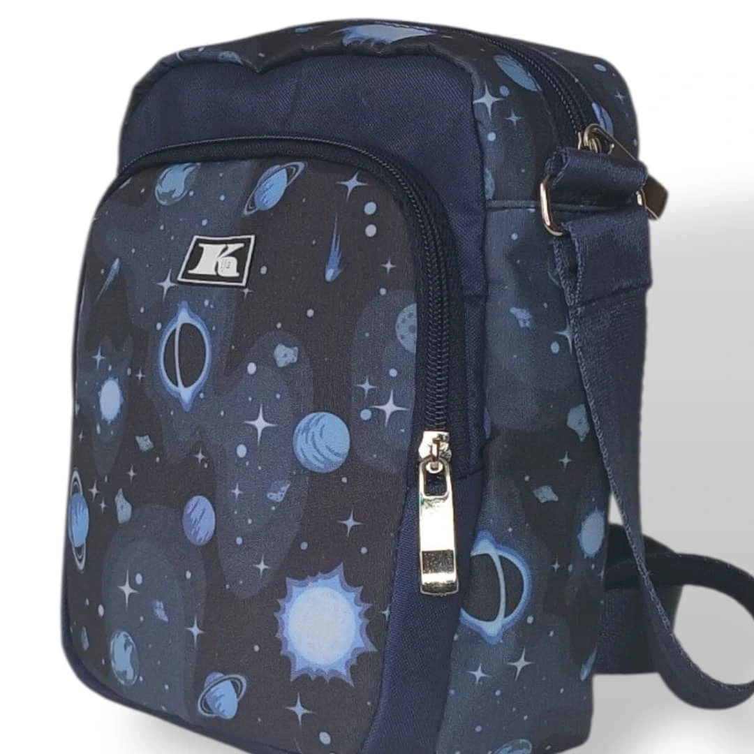 کیف دوشی کوچک مدل کهکشان جنس پلی استر استر رویال درجه یک گاندوزی شده با نوار برزنت و دارای یراق آلات فلزی درجه یک. ابعاد ۷×۱۸×۲۲ سانتیمتر و دارای ضمانت شش ماهه.